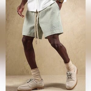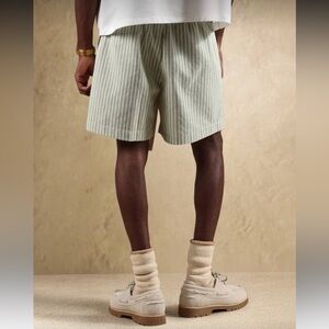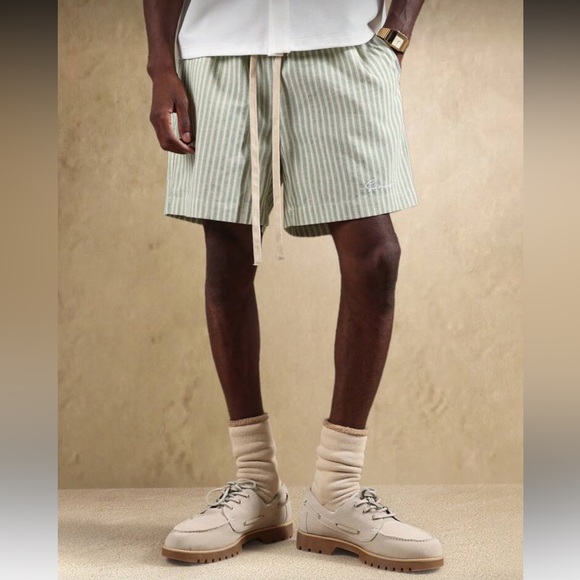 Stylish striped green shorts paired with classic tan boat shoes. Perfect for a casual day out.