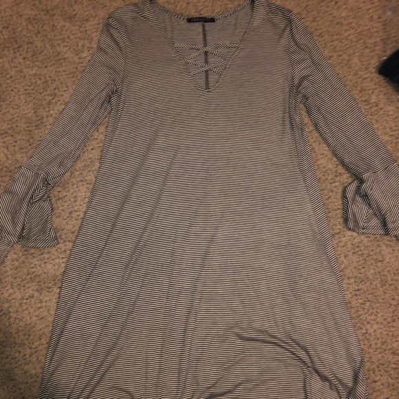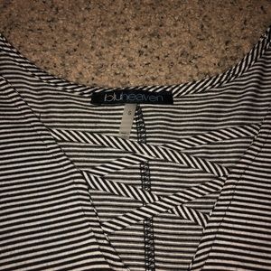 Bluheaven Long Sleeve black and white striped dress. Has a crossed v-neck, pockets on both sides and super fun flowy/layered sleeves.