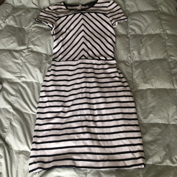 Fitted, stripped short-sleeve dress. Very comfortable with a lot of stretch! Ends just above the knee.