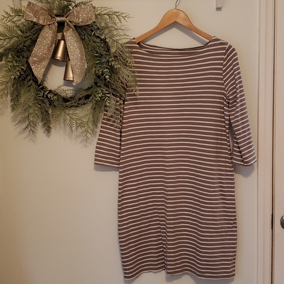 3/4 length sleeves, scoop neck striped cotton dress with pockets, super versatile!