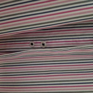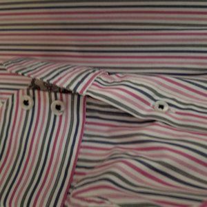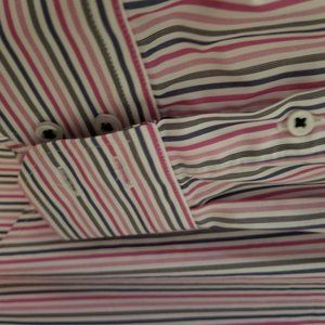 Pinks, greys, and white stripes line this dress shirt.