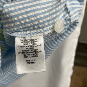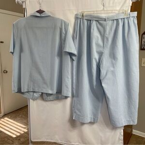 Blue and white striped short-sleeved shirt with floral embroidery and matching belted pants. No visible flaws; excellent preowned condition. Tags have been removed. See measurements below.