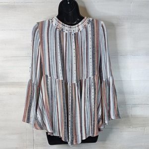 The brand and size tags are missing but it measures out to be a size small. Very cute beaded neckline with bell styled sleeves. It would be prefect with a pair of denim jeans or shorts and sandals.