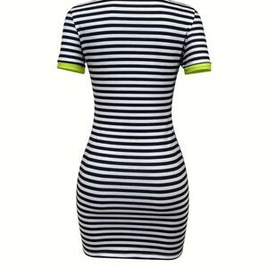 Fun striped t-shirt dress featuring a playful bear graphic. Accented with lime green details.