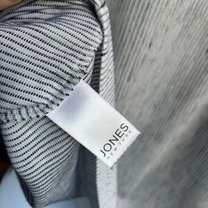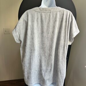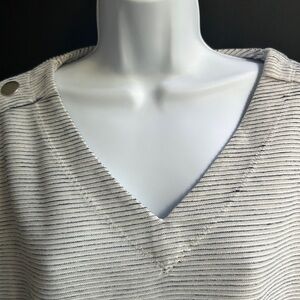 Stylish gray V-neck top with button detail on the shoulders. Features a subtle striped pattern. The size tag was cut off (please see last photo). Comes from a smoke-free home.