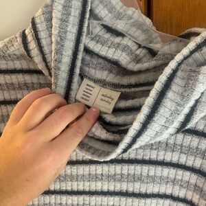 Stay cozy and stylish with this striped gray and black sweater. Perfect for layering, this sweater offers comfort and elegance for any occasion.