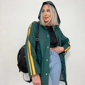 Striped Green Heavy Button Down Hooded Raincoat