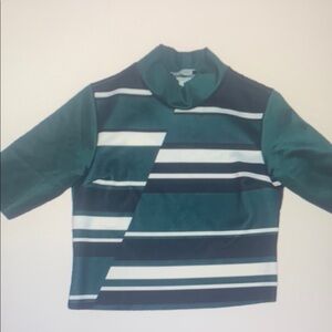 This stylish kids shirt features a modern striped design in green and blue. Perfect for any occasion, it offers comfort and a trendy look.