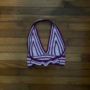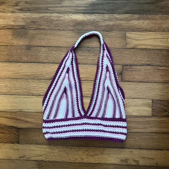 Stylish knit halter top with a deep V-neck. Features a striped pattern in purple and white. Worn only a few times!