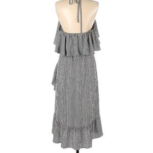 Elegant halter neck dress featuring a stylish striped pattern and ruffle details. Perfect for any occasion.