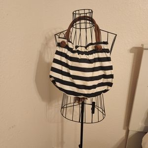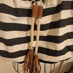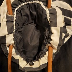 Black and white striped handbag. Brown and gold straps and hardware. Snap close. Canvas- like material. Nice used condition.