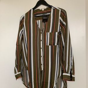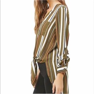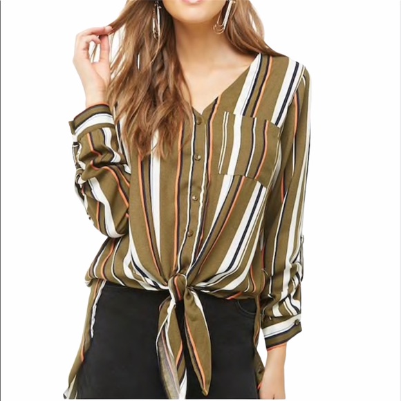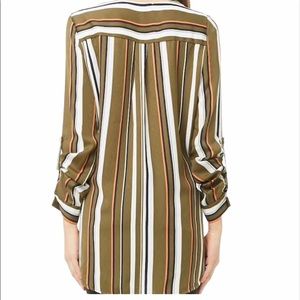 • A soft woven shirt featuring an all over multi stripe print, a V-neckline, front button closures, long button cuffed sleeves with roll tabs, a chest patch pocket, high-low hem, and a self tie front.