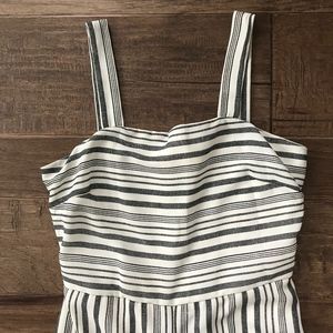 This black and cream jumpsuit has a shirring elastic back. Cropped length.