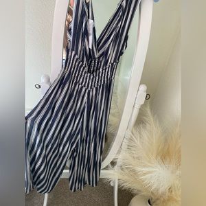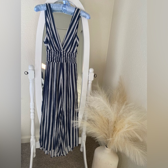 Navy and white Striped jumpsuit from local boutique. Pants hit at calf. Flowy and super cute. Size small. New with tags.