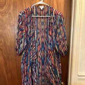 Add a burst of personality to your wardrobe with this lightweight kimono-style cardigan featuring a vibrant geometric print in striking shades of blue, pink, yellow, and black. The open-front drape and flowy sleeves create a relaxed, effortless silhouette that’s perfect for layering year-round. Size: M Condition: NEW