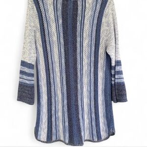Cozy knit top with navy and light blue pattern. Soft texture and relaxed fit. Semi sheer.