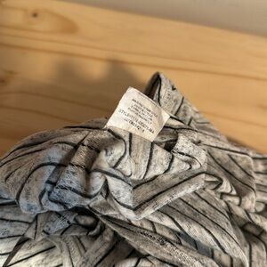 Cute heathered striped T-shirt with knotted tie at waist. Polyester rayon, cotton, and spandex blend. In very good used condition, no damage, no pit stains, or tears. Some very light pilling