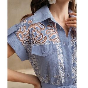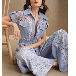 Striped Lace Button Cuff Sleeve Belted Wide Leg Jumpsuit