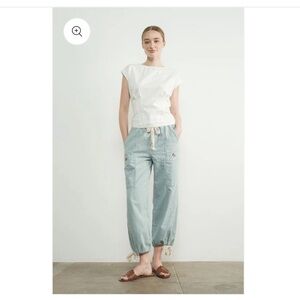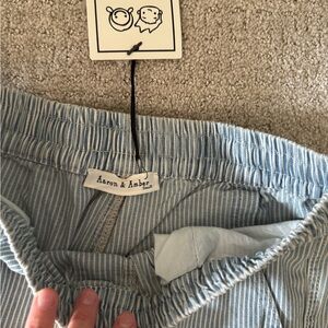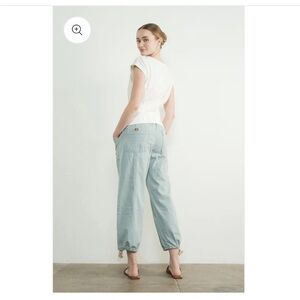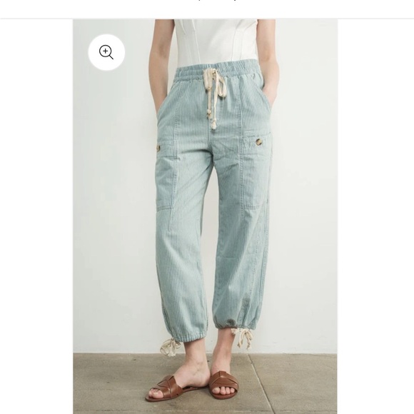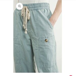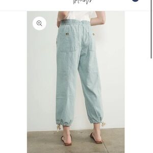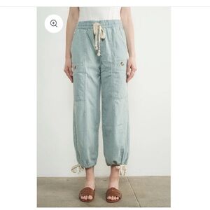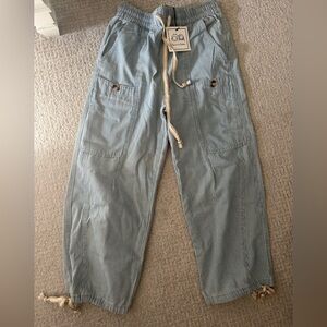 Casual light blue pants with drawstring waist and ankle ties. Features a subtle striped pattern.