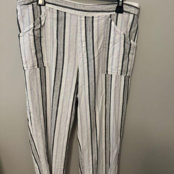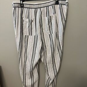Stylish striped linen pants with a comfortable fit. Features black and white stripes.