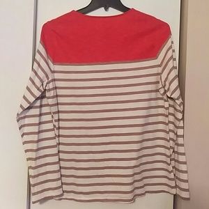 XL-16 long sleeve shirt with button details on both shoulders. Color blocked on top with a red (that can almost look red orange at times) stripe. Remainder is brown/tan and cream/white stripes. Brown/tan stripes have heathered effect, also. Button details are brown to match the stripes. Slight pilling but in great shape. Only worn a few times.