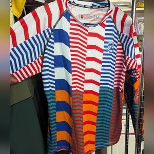 Vibrant striped tech tee with a bold graphic design. Features red, blue, orange, and white stripes.