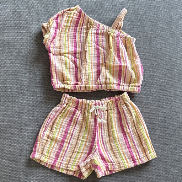 Adorable kids matching set. Features a one-shoulder top and shorts. Pink and yellow stripes. Comfortable and stylish.