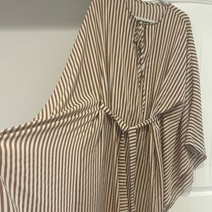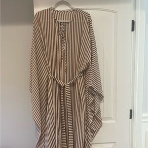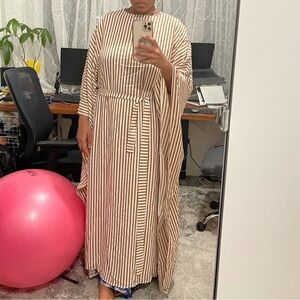 Elegant striped maxi dress featuring a stylish brown and white pattern. Perfect for any occasion with its comfortable fit and chic design.