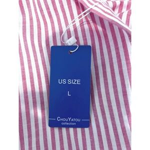 Keywords: Chouyatou, midi dress, shirt dress, striped dress, red and white, casual dress, women's clothing, size L, cotton dress, button down, three quarter sleeve, collared dress, new with tags