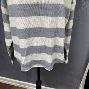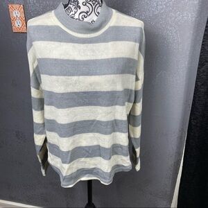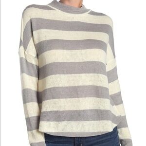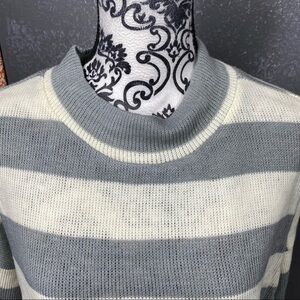 Striped Mock Neck Dolman Sleeve Sweater grey and white. Long sleeve fall winter
