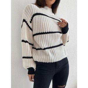 Striped Mock Neck Drop Shoulder turtleneck Sweater cream black