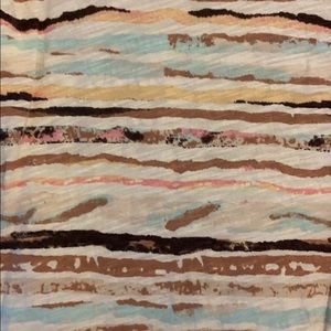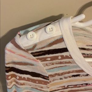 Pinks, earth tones, and pale turquoise in a loose stripe - elbow length sleeve with button accents. Size is xs but fits like a small/medium.