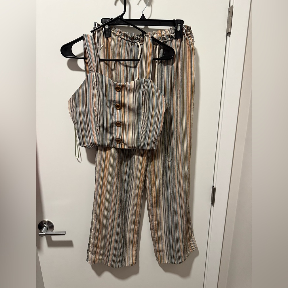 Tank top and pant striped set. The pants are full length and flowy. The tank top matches and has buttons down the front. Super cute and fun for vacation or casual day events. Both top and bottom are size small from a boutique.