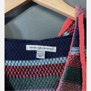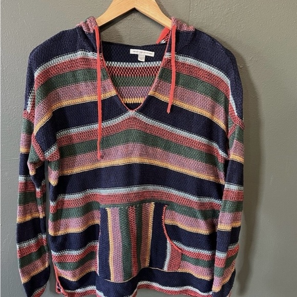 Vibrant striped V-neck sweater. Features a cozy hood and front pocket. Ideal for casual wear.