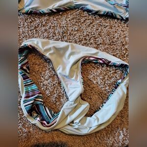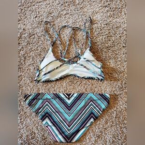 Dive into style with this chic striped bikini set. Featuring a vibrant multicolor design, this swimwear is perfect for making a splash. Enjoy comfort and fashion at the beach or pool. Either a size medium or small.