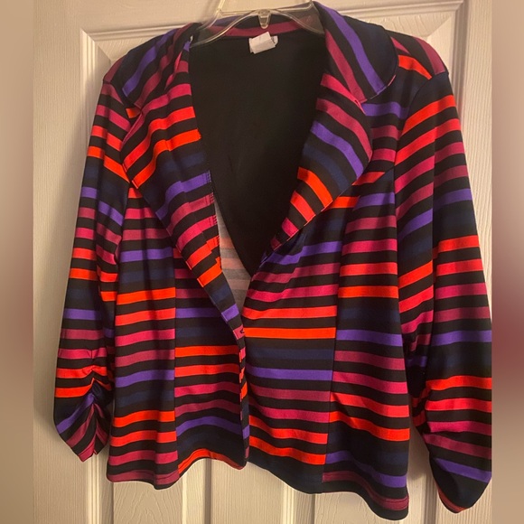 Vibrant striped blazer with red, purple, and black hues. Perfect for a bold statement.