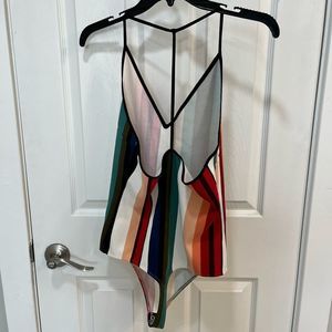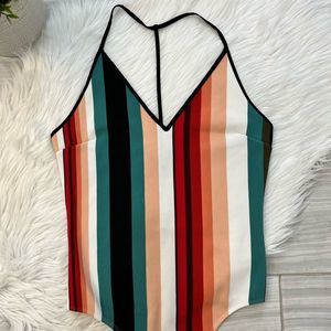 Vibrant striped bodysuit featuring a mix of red, green, and tan hues. Perfect for adding a pop of color to your wardrobe.
