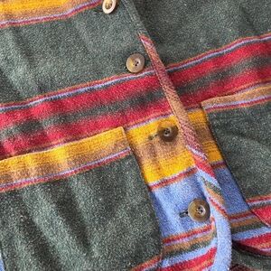 Vibrant striped vest with button-up front. Features pockets for convenience. Perfect for layering.