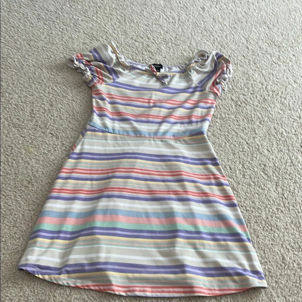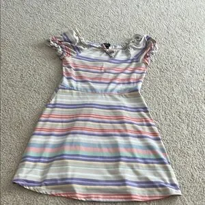 Chic dress with multicolor stripes. Features short sleeves and a flattering fit.