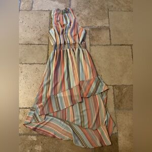 Elevate your style with this chic striped halter dress. Featuring a vibrant mix of colors, it's perfect for any occasion. The flowing design adds a touch of elegance.