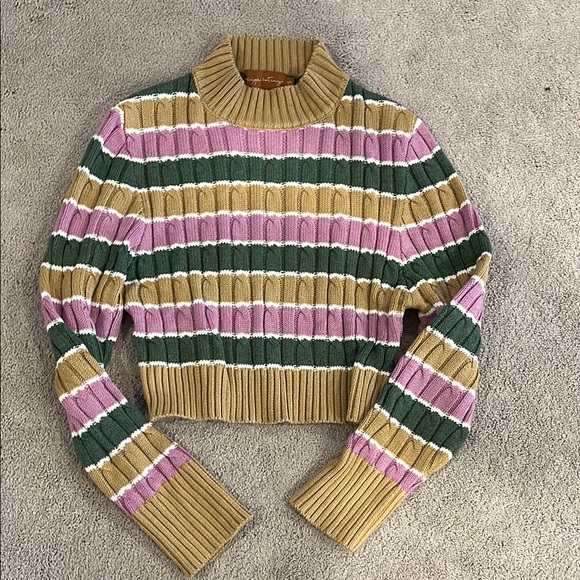 Stay cozy and stylish with this striped ribbed cropped sweater. Featuring a blend of fuschia, green, and tan colors, it's perfect for any casual outing. Has some stretch, but fits more like an XS.