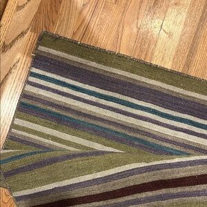 Beautiful striped handwoven wool rug with a mix of colors. Perfect for adding a pop of color to any room. Size 2’ x 3’