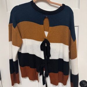 Stay cozy and stylish with this striped multicolor sweater. Featuring a blend of blue, brown, white, and black, this sweater is perfect for any casual outing.