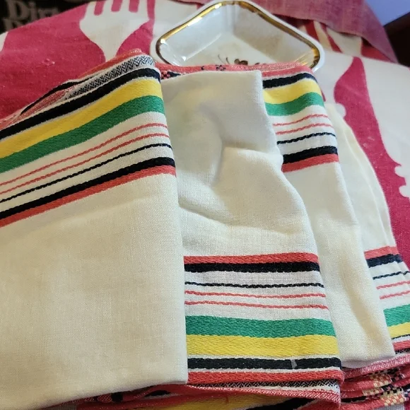 Enhance your dining experience with these vibrant striped table linens. Featuring a mix of white, green, yellow, pink, and black, these linens add a splash of color to any table setting.