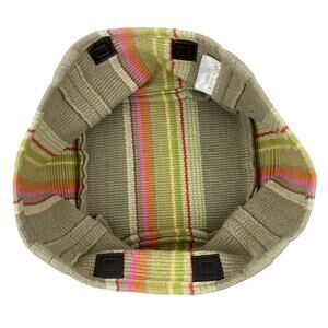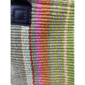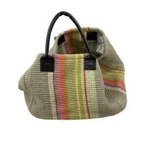 This stylish tote bag features a vibrant striped design with shades of green, pink, and tan. Perfect for any occasion, it combines fashion with functionality.