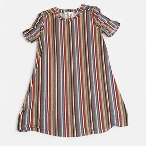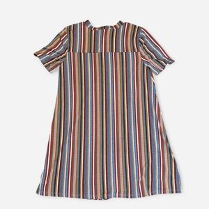 This stylish women's T-shirt swing dress features a vibrant multicolor stripe pattern, perfect for any occasion. The comfortable fit and eye-catching design make it a must-have addition to your wardrobe.