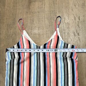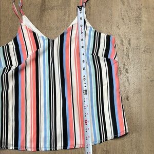 This stylish women's top features a vibrant striped pattern in black, white, blue, and pink. Perfect for adding a pop of color to your wardrobe.