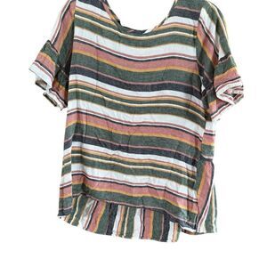 Elevate your wardrobe with this stylish striped top. Featuring a blend of green, pink, and yellow hues, this top is perfect for any casual outing. Enjoy the comfort and fashion-forward design. Linen rayon blend P250 B548