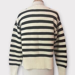 Autres Filles Textured Knit Striped Pullover Sweater. Boxy fit with loose ribbed waist and cuffs, split hem. Dark navy and white nautical inspired. Soft cozy cotton and acrylic blend.