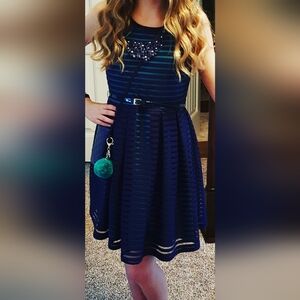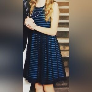 Charming kids dress featuring a stylish navy blue and teal striped pattern. Perfect for any occasion.